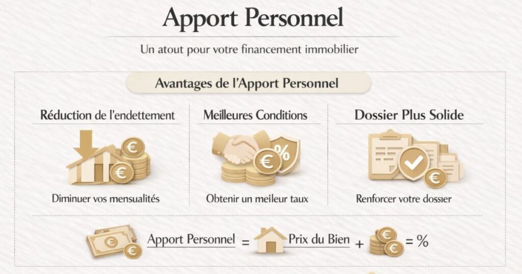 Au-delà du montant, l’apport envoie un signal à la banque : vous avez une capacité d’épargne, vous êtes impliqué dans le projet, vous ne venez pas « tester » le système. Un apport de 20 % rassure et peut améliorer les conditions du crédit (taux, assurance, garantie).