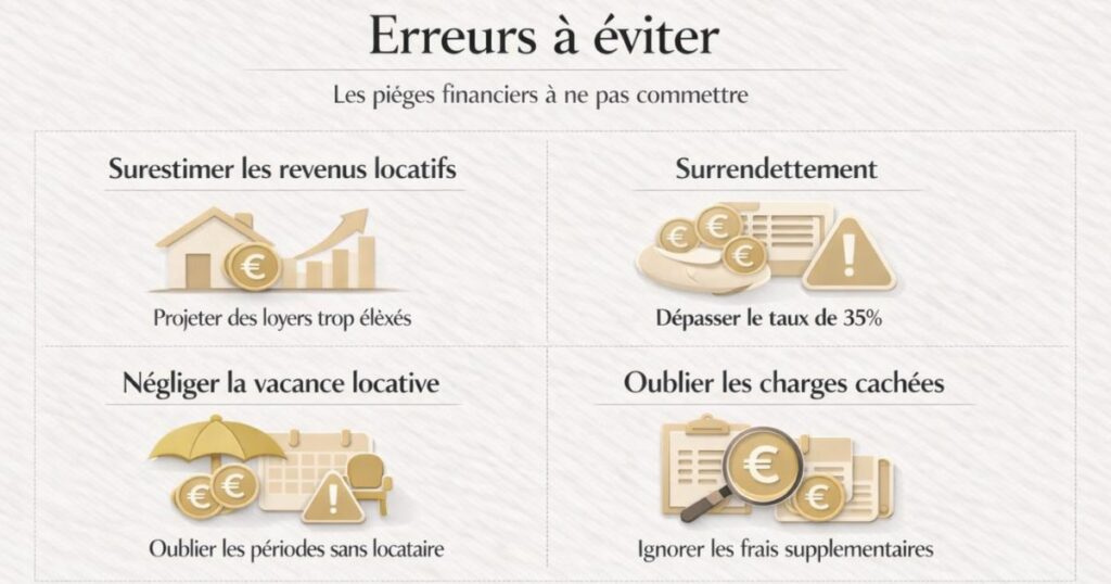 Présenter un loyer espéré très au-dessus du marché local est contre-productif : la banque a accès aux données de marché et le conseiller le verra immédiatement. Une simulation réaliste, légèrement conservatrice, est bien plus crédible qu’une simulation flatteuse.