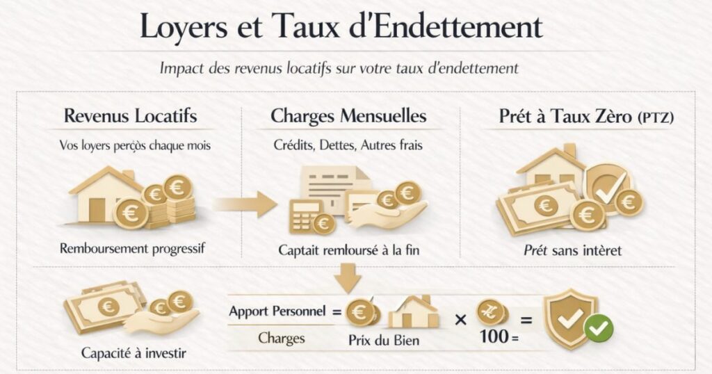 Certaines banques appliquent la méthode de compensation : elles intègrent les loyers attendus dans les revenus pour le calcul du taux d’endettement. Les loyers sont généralement retenus à 70 % de leur montant brut (pour tenir compte de la vacance locative et des charges).